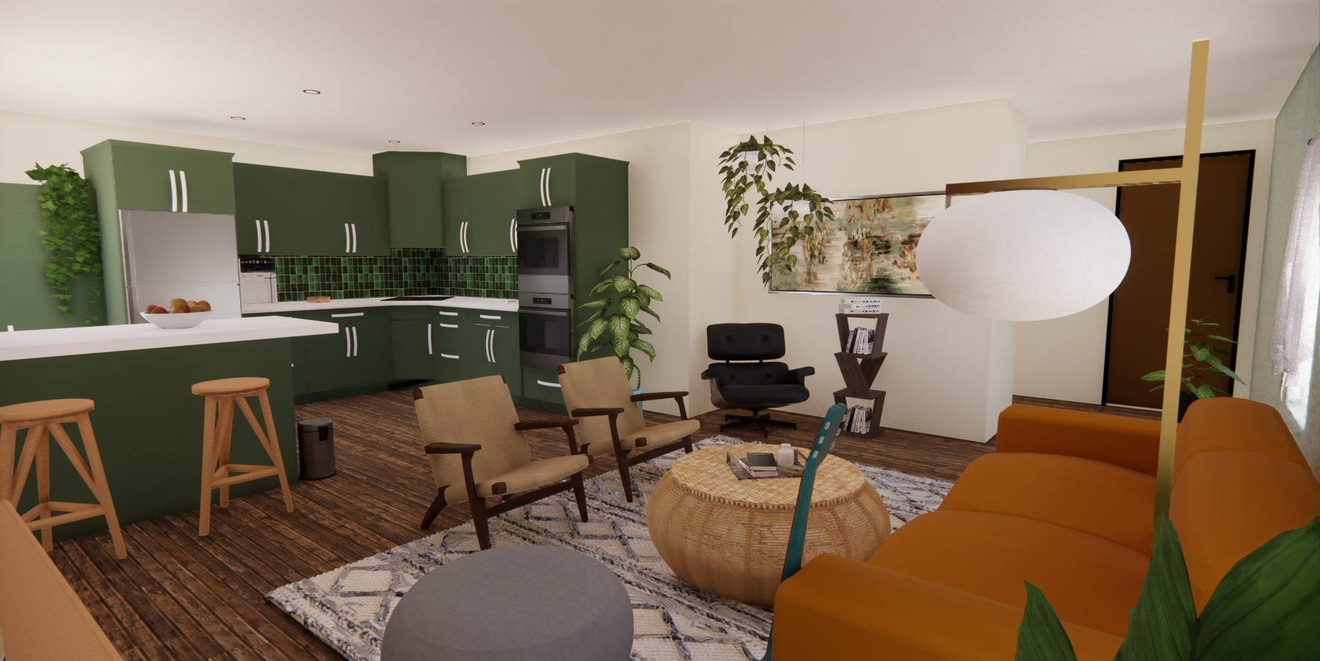 Apartment based on my MBTI personality, ENFP. ENFPs, being extroverted and intuitive people, tend to enjoy open floorplans and moveable furniture to help promote conversation and community amongst guests. They also are more inclined to incorporate greenery. Since they are highly active individuals, pulling inspiration from the bohemian aesthetic was essential in creating the perfect environment for an ENFP personality to unwind while also keeping them stimulated and inspired.
